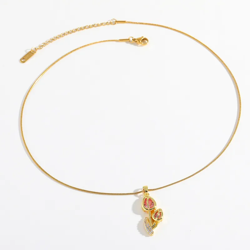Gold Plated Stainless Steel Anti Tarnish Zirconia Embedded Tulip Pendant Necklace